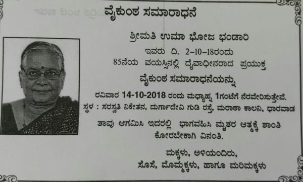 ಉಡುಪಿ ಬೈಲೂರು ದಿವಂಗತ ಸಂಕಿ ಭಂಡಾರಿ ಮತ್ತು ಕುಂದಾಪುರದ ದಿವಂಗತ ವೆಂಕಟಪ್ಪ ಭಂಡಾರಿ ದಂಪತಿಯ ಪುತ್ರಿ ಹಾಗೂ ಉಡುಪಿ ಪಾಂಗಾಳ ದಿವಂಗತ ಭೋಜ ಭಂಡಾರಿಯವರ ಪತ್ನಿ ಶ್ರೀಮತಿ ಉಮಾ ಭೋಜ ಭಂಡಾರಿಯವರು ಅಕ್ಟೋಬರ್ 2 ರ ಮಂಗಳವಾರದಂದು ಧಾರವಾಡದಲ್ಲಿರುವ ಹಿರಿಯ ಪುತ್ರಿ ಶ್ರೀಮತಿ ಪ್ರೇಮಾ ಮರೋಳಿಯವರ ಮನೆಯಲ್ಲಿ ನಿಧನರಾದರು.ಅವರಿಗೆ 85 ವಷ೯ ವಯಸ್ಸಾಗಿತ್ತು.